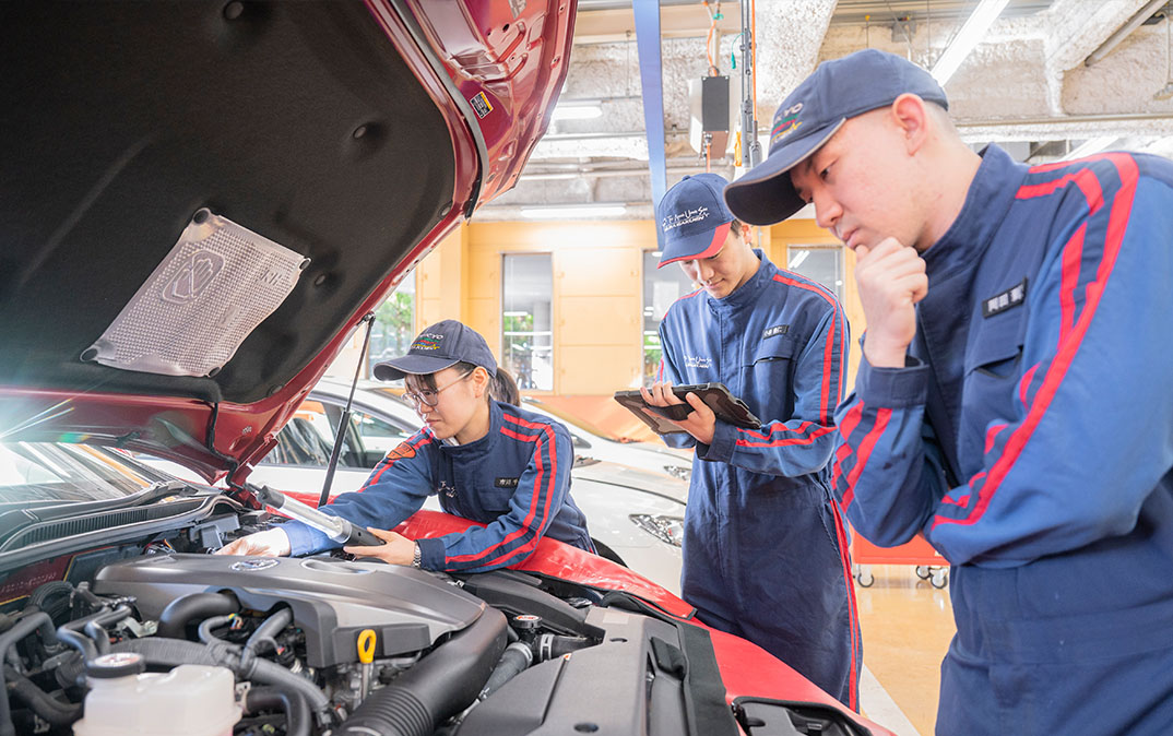 MORE「進路決定率100%」が証明する本気の就職・進路サポートや、GTR・フェラーリ・テスラなどの幅広い車種の実習車を揃えています。そして、仲間と一緒に本気で遊び、楽しめるTAUSならではのクラブ活動もあり、熱意あふれる教師が業界現場で通用するスキル・知識・意識を本気指導しています。