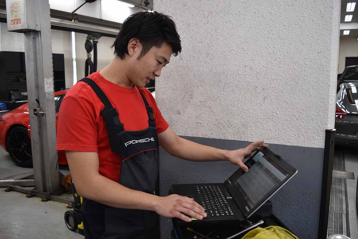 整備作業に集中できるというレースメカニックの環境に惹かれ、就職を決めました。普段はポルシェの一般整備や車検などを行っています。夏にはレースメカニックとしてレースのサポートを体験。ポルシェは市販の状態のままサーキットでも走れる車なので、日々の整備作業をそのままサーキットでも活かすことができました。